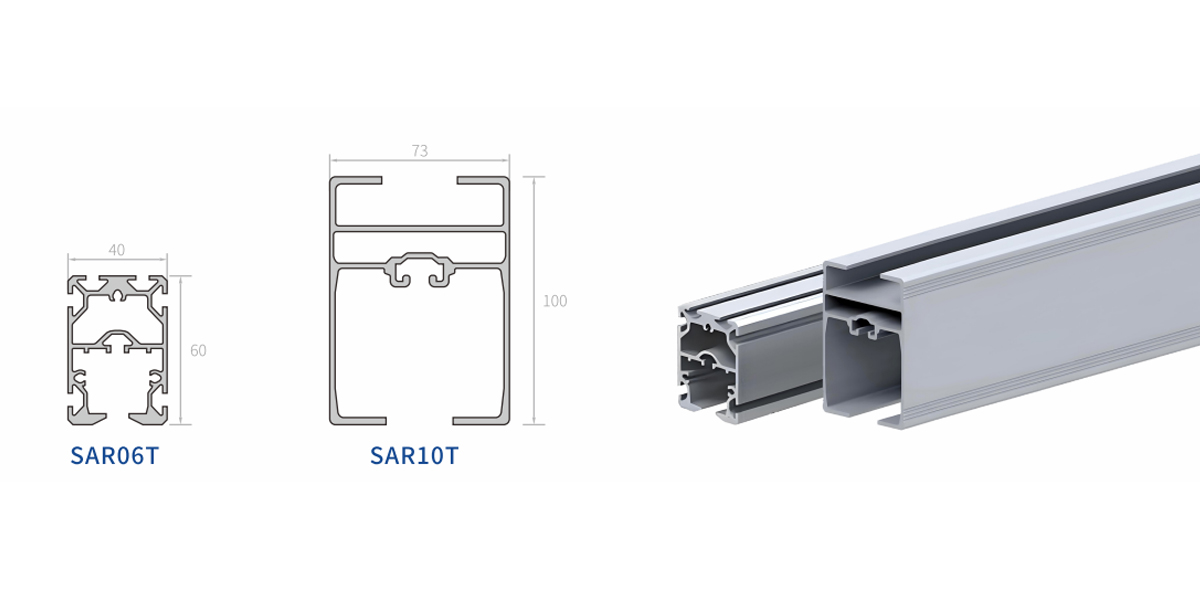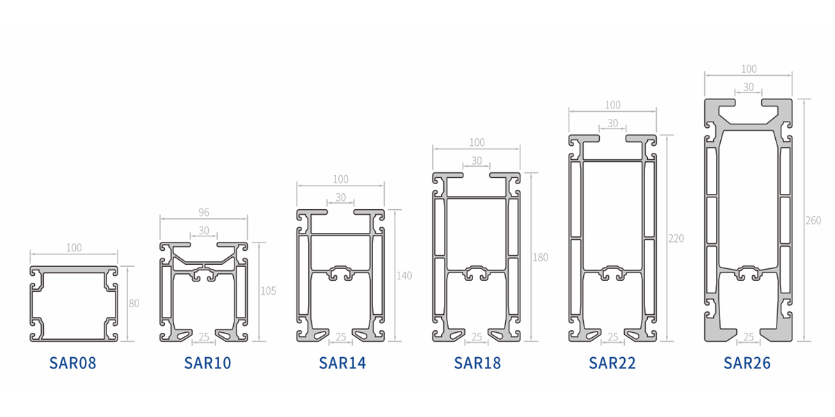 | SAR08 | Alumínium, eloxált | 4,1 kg/m | 152cm^4/202cm^4 | 30cm^3/40cm^3 |