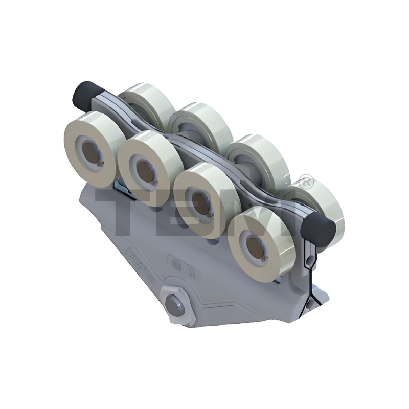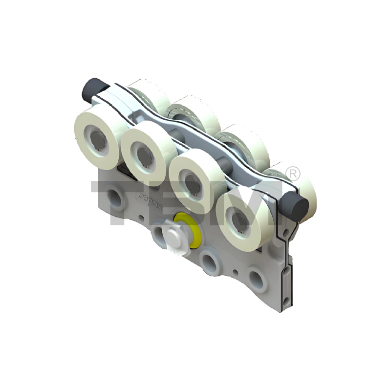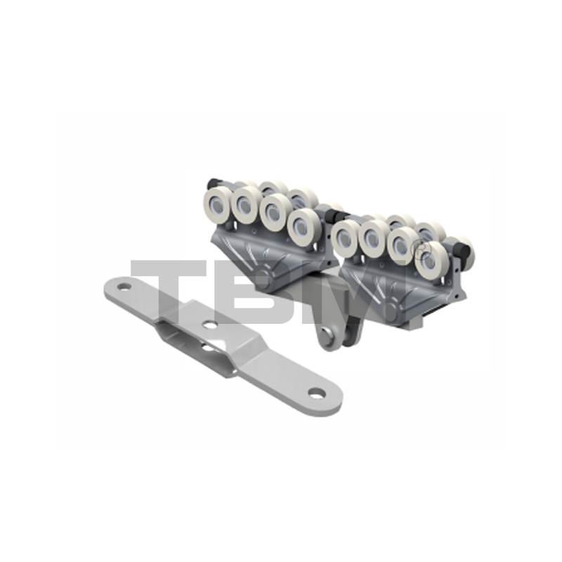 ■ A kocsi nagy szilárdságú, kopásálló nylonból présöntött/kovácsolt a sima siklás és a könnyű kezelés érdekében. Two rows of upper and lower rollers provide pry-resistant and anti-bias protection.